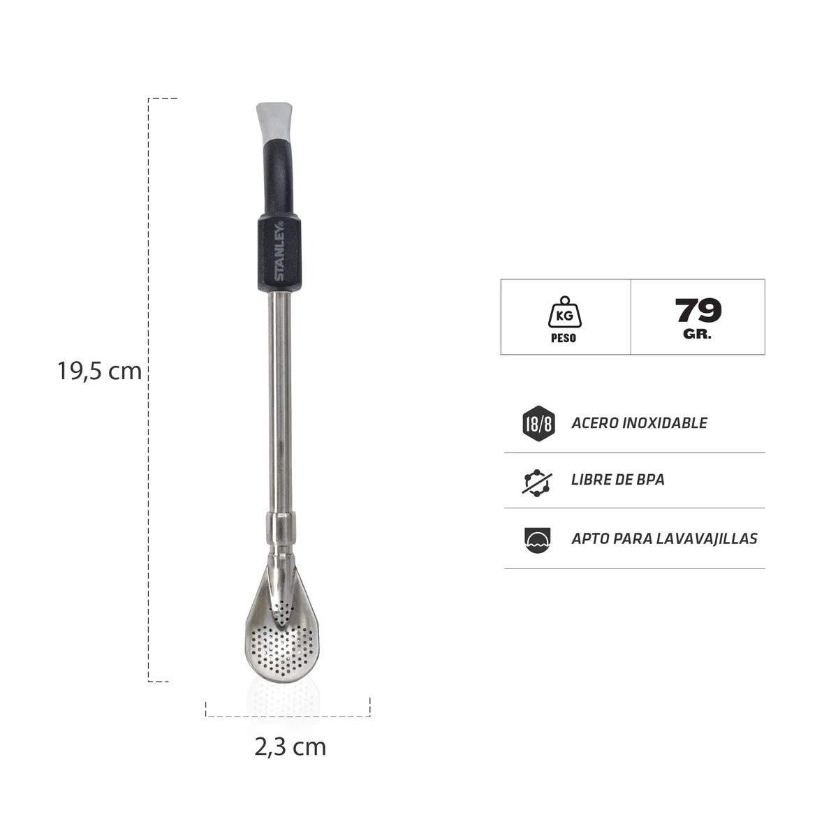 La bombilla Stanley Spoon representa la ingeniería aplicada al ritual más tradicional de Argentina. Construida íntegramente en acero inoxidable 18/8 de grado alimenticio, esta pieza destaca por su robustez y su capacidad para mantenerse inalterable frente al paso del tiempo y el uso constante. Su diseño ergonómico de 19 cm de largo asegura una comodidad excepcional en cada cebada, adaptándose perfectamente a cualquier tamaño de mate.