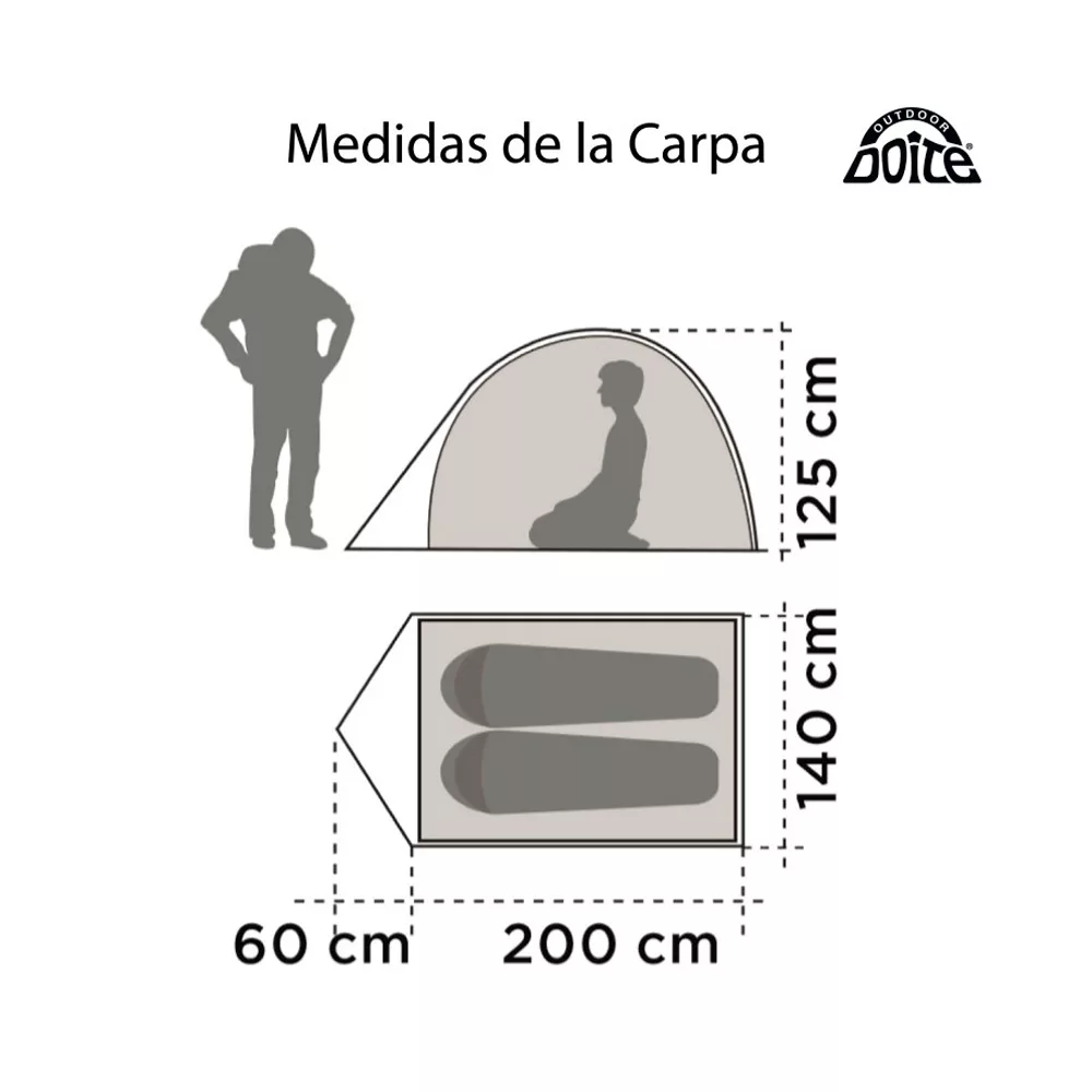 La carpa Doite Zander para dos personas pertenece a la línea clásica familiar y se caracteriza por su diseño tipo iglú de armado sumamente sencillo. Esta unidad ofrece un espacio interior confortable con un largo total de 260 centímetros, un ancho de 140 centímetros y una altura de 120 centímetros, ideal para quienes buscan practicidad en sus salidas al aire libre. Su estructura se basa en dos varillas de fibra de vidrio que proporcionan estabilidad y resistencia ante las condiciones del terreno.