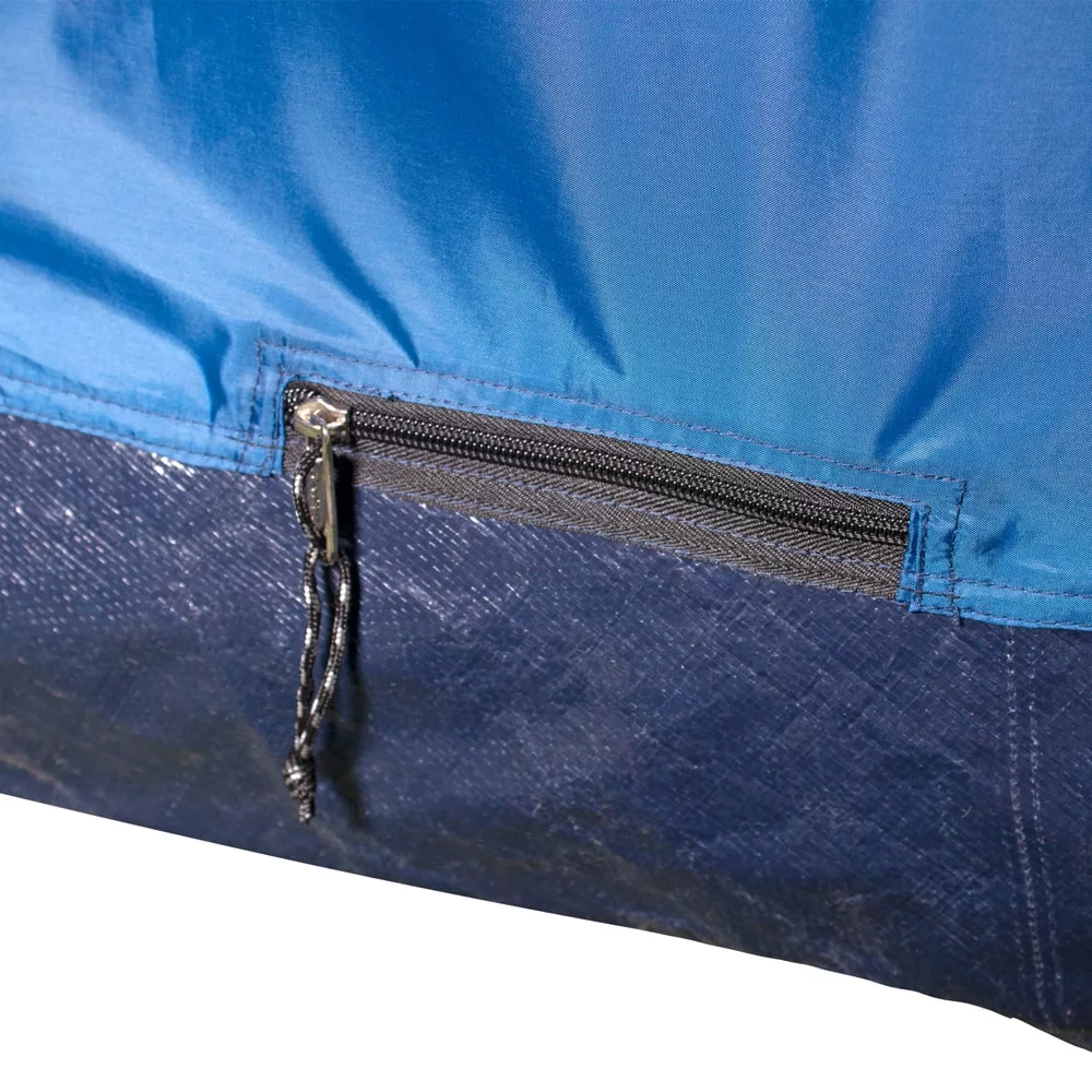 La estructura se sostiene sobre un sistema de cinco varillas de fibra de vidrio que garantizan estabilidad y resistencia. La protección climática está asegurada por una impermeabilidad de 3000 milímetros tanto en el cubretecho como en el suelo, complementada con costuras selladas para bloquear cualquier ingreso de humedad. Este modelo es especialmente eficiente en climas cálidos debido a sus tres puertas de acceso, dos ventanas interiores y salidas de ventilación estratégicas que promueven una circulación de aire constante, evitando el sofocamiento y la condensación.