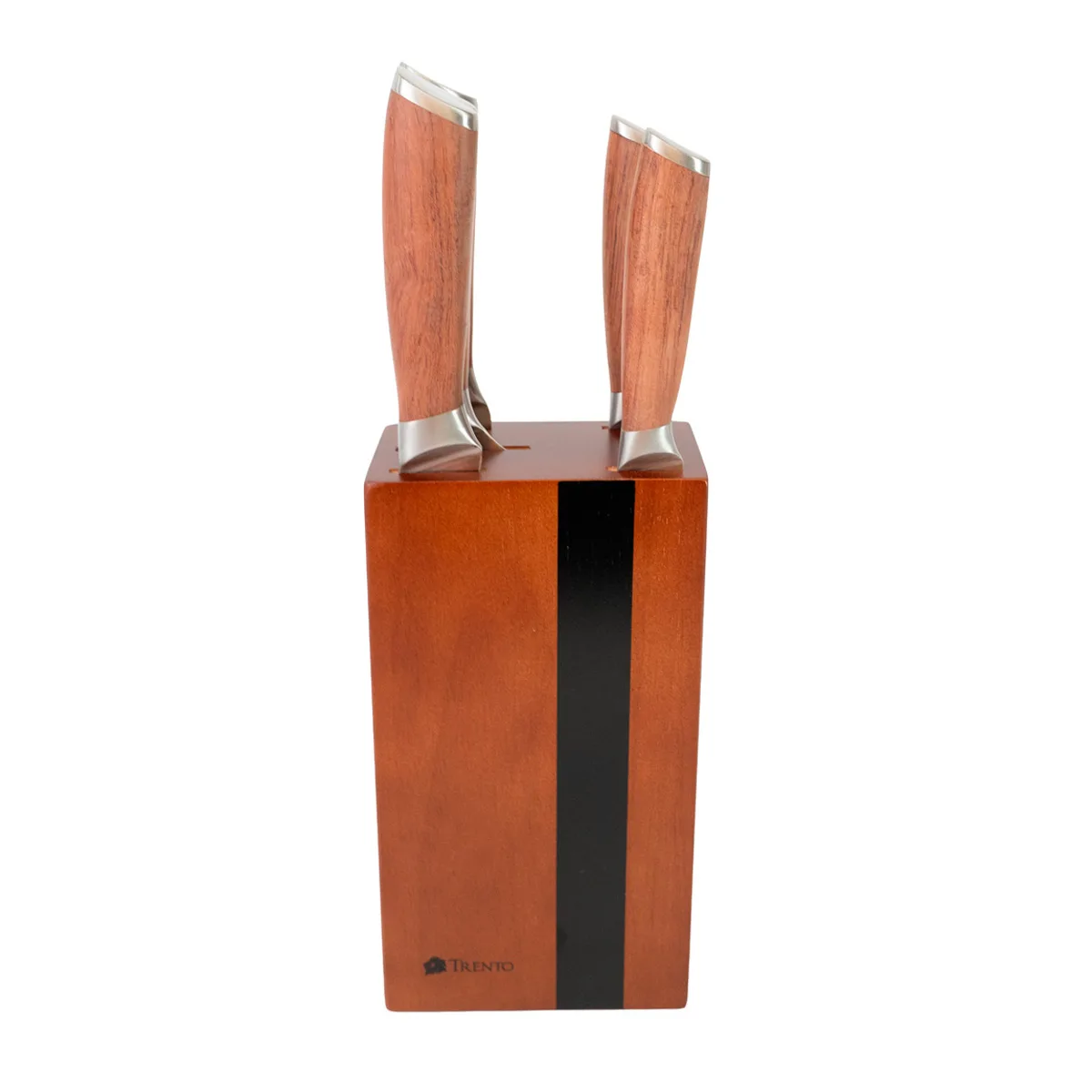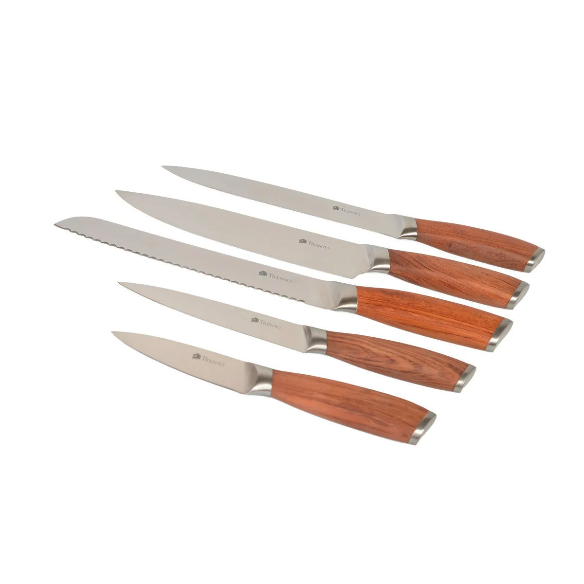El set Trento Malmo incluye 5 piezas de alta calidad con hojas de acero inoxidable 420. Destaca por su filo liso y mangos elegantes de madera palo rosa.