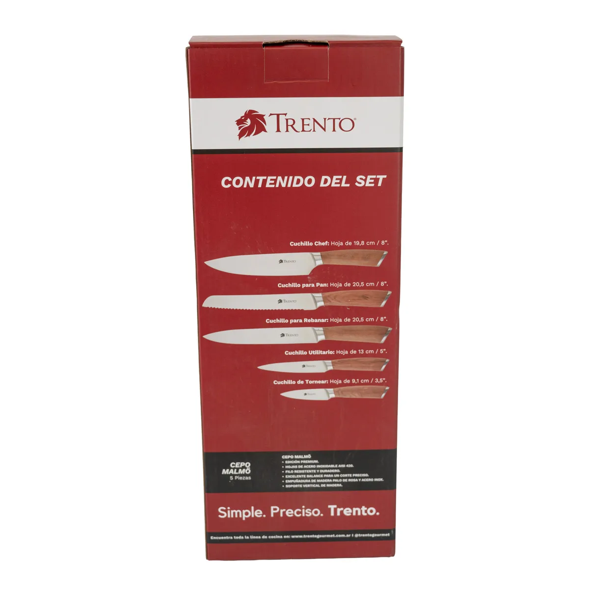 El cepo Trento Malmo de 5 piezas ofrece una solución integral y estética para el equipamiento de la cocina moderna. Este set incluye una selección de cuchillos fundamentales fabricados con hojas de acero inoxidable 420, un material que garantiza una excelente retención del filo liso y una resistencia superior ante el uso cotidiano. La precisión en el corte se complementa con un diseño sofisticado que realza cualquier mesada gracias a su base de almacenamiento vertical.