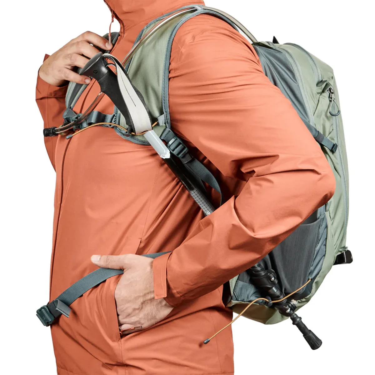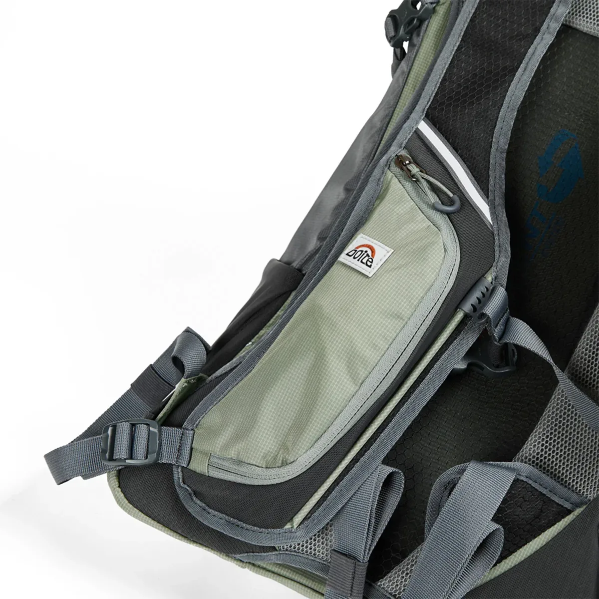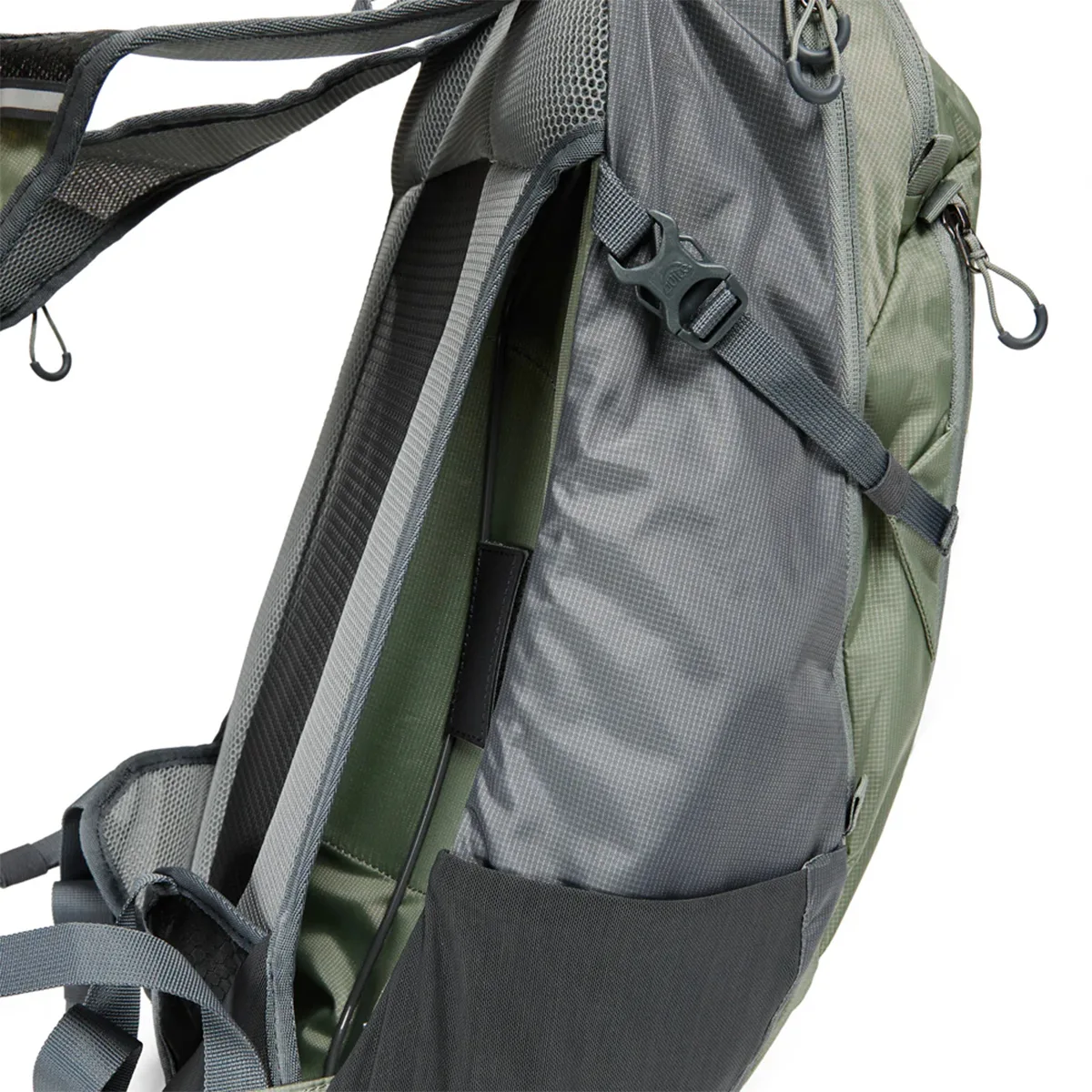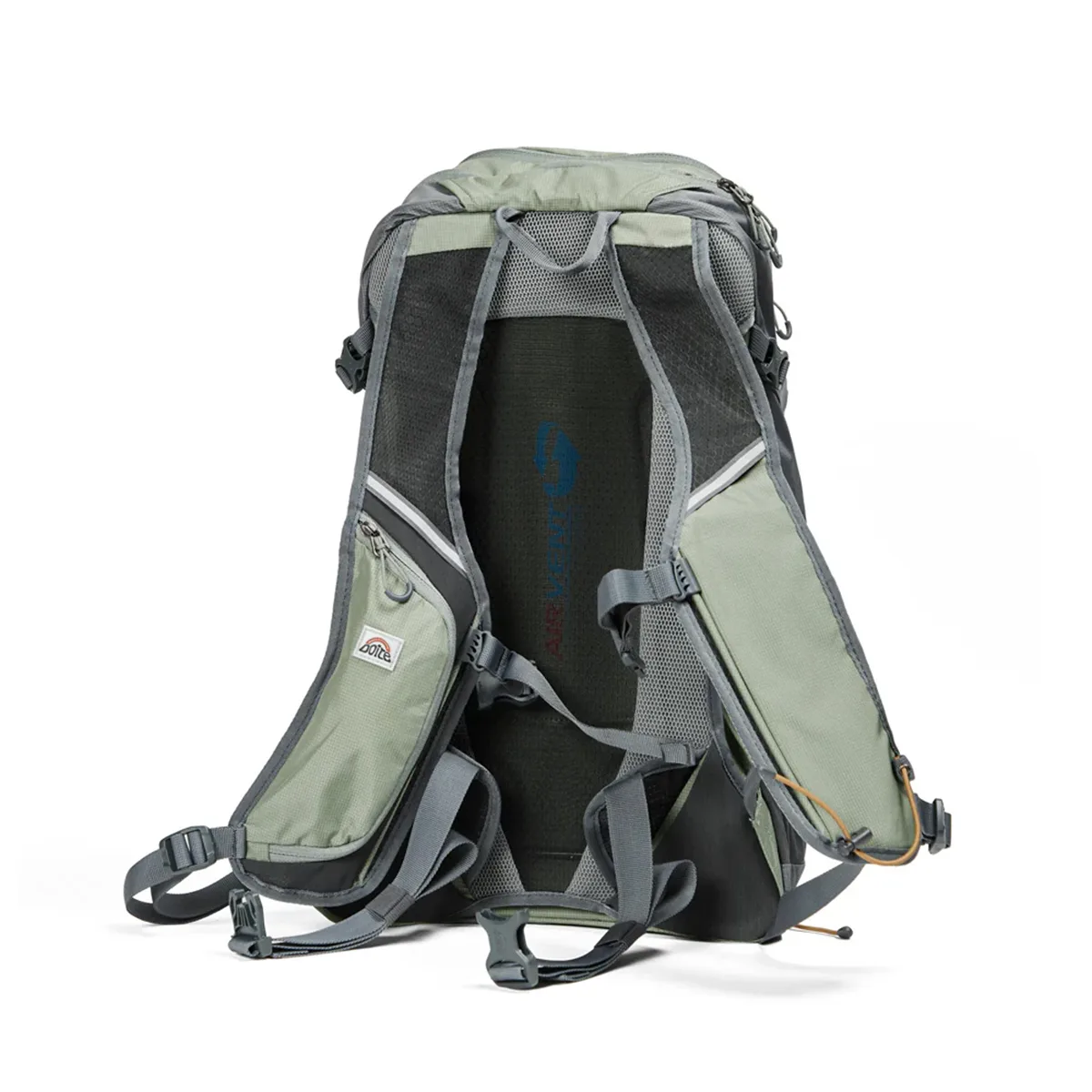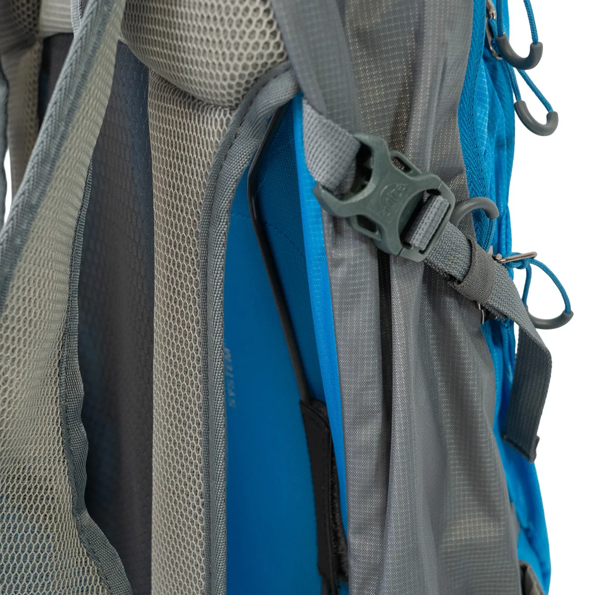 Incluye cinturón de ajuste lumbar, cinturón de ajuste pectoral, hebilla con soporte para manguera de hidratación en la correa del pecho, 2 Salidas para manguera de bolsa de hidratación, correas de compresión laterales, porta Piolet-bastón, reflectante de seguridad en la parte frontal y en correas de hombro.