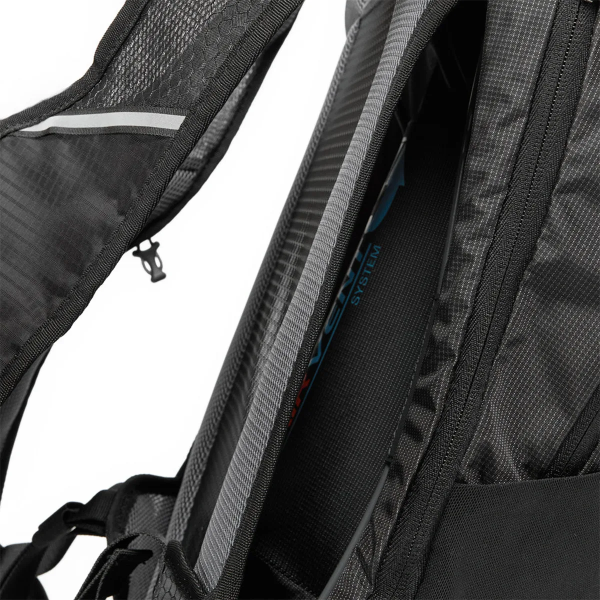 Incluye cinturón de ajuste lumbar, cinturón de ajuste pectoral, salida para manguera de bolsa de hidratación, con portacascos, reflectante de seguridad en la parte frontal y en correas de hombro, hebilla con soporte para manguera de hidratación en la correa del pecho.
