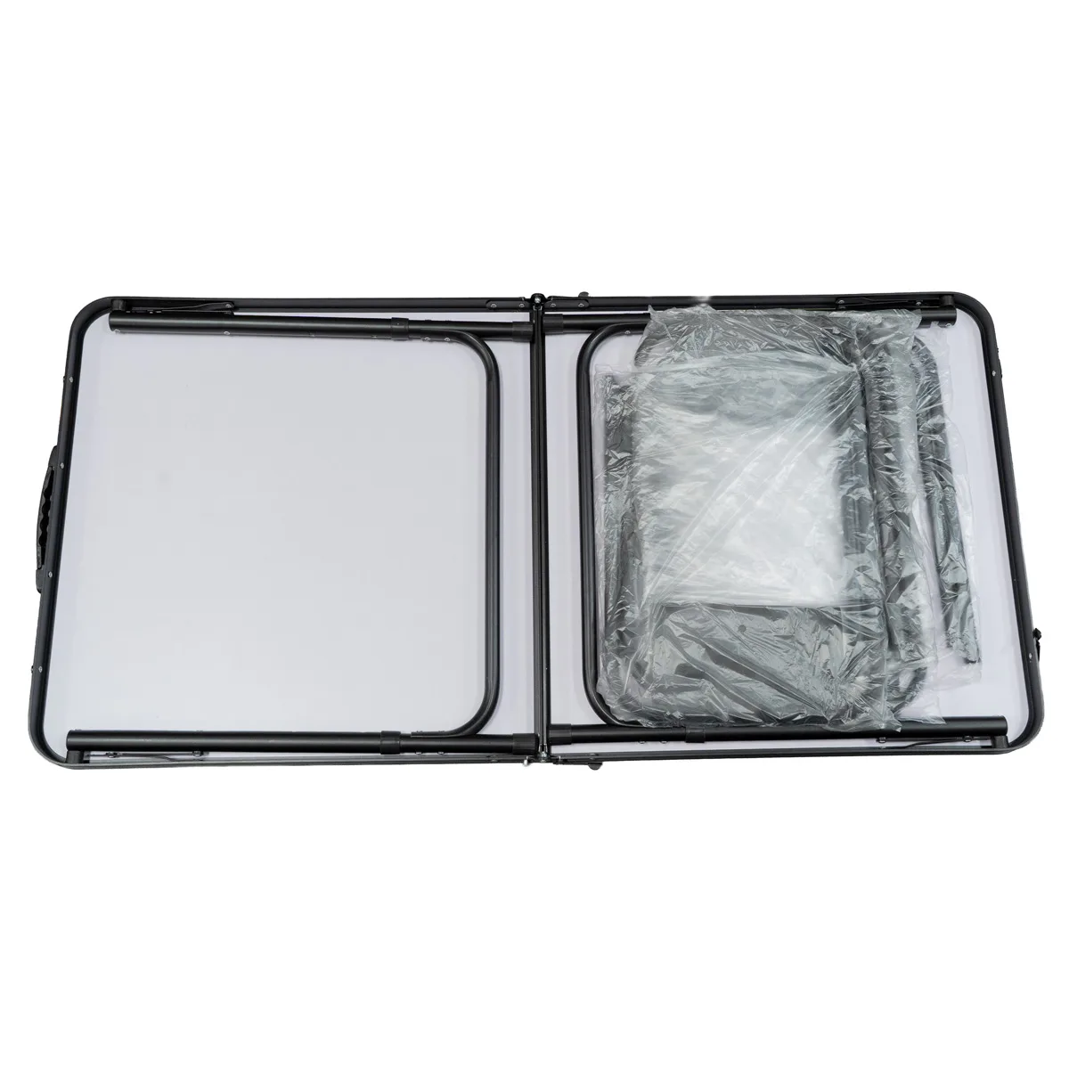 Los bancos plegables incluidos cuentan con asiento de tela Oxford 600D, cómoda, firme y fácil de limpiar. Todo el conjunto es compacto, funcional y portátil, ocupando muy poco espacio una vez plegado.