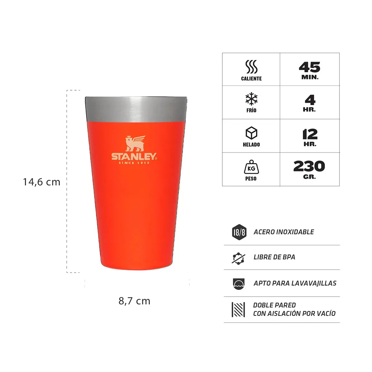 Vaso térmico apilable con doble aislación a prueba de golpes, ideal para que tu cerveza permanezca fría. Son fáciles de transportar, ideales para acampar, cumpleaños o llevar a cualquier ocasión, además se apilan infinitamente para ahorrar espacio en tu cocina. Mantiene tus líquidos calientes durante 45 minutos, fríos durante 4 horas o congelados durante aproximadamente 15 horas.