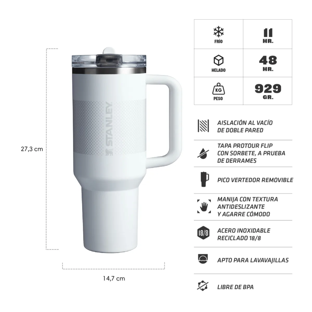 El icónico Quencher alcanza un nuevo nivel de practicidad con su sistema ProTour Flip Straw, permitiendo beber de forma rápida y cerrar el flujo herméticamente para evitar cualquier tipo de pérdida. Su imponente capacidad de más de un litro lo convierte en la opción preferida para quienes pasan largas jornadas fuera de casa y exigen agua helada en todo momento.